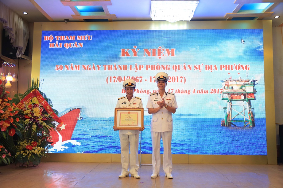 Thừa ủy quyền của Bộ trưởng Bộ Quốc phòng, Chuẩn Đô đốc Nguyễn Trọng Bình trao Bằng khen của Bộ Quốc phòng cho Ph&ogr...