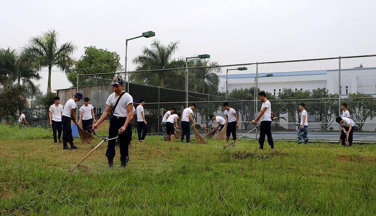 Đoàn viên thanh niên Đoàn cơ sở Lữ đoàn 602 cắt cỏ, dọn vệ sinh sân bóng đá Cán bộ, đo&ag...
