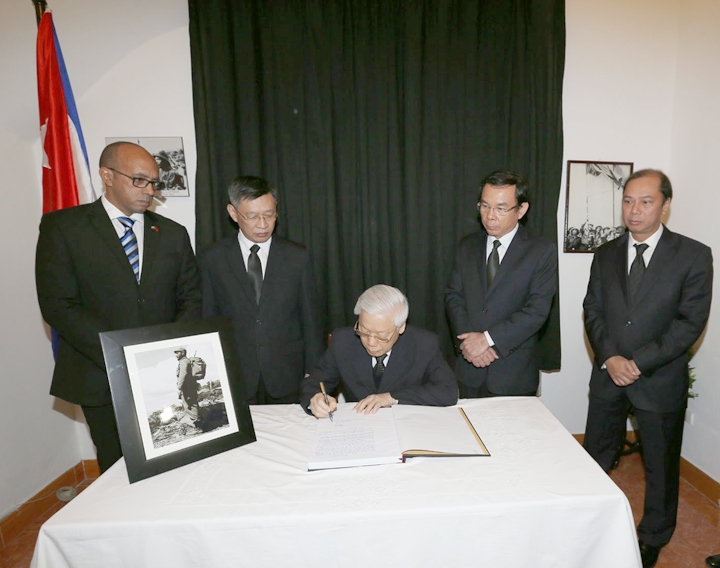 Các đồng chí: Nguyễn Phú Trọng, Trần Đại Quang, Nguyễn Xuân Phúc và lãnh đạo Đảng, Nhà nước viếng Lãnh tụ Cu-ba Phi-đen Ca-xtơ-rô Ru-xơ