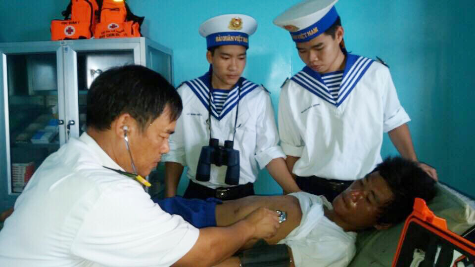 Cán bộ, chiến sĩ Nhà giàn DK1/14 chăm sóc sức khỏe cho ngư dân Trương Minh Ý Trước đó...