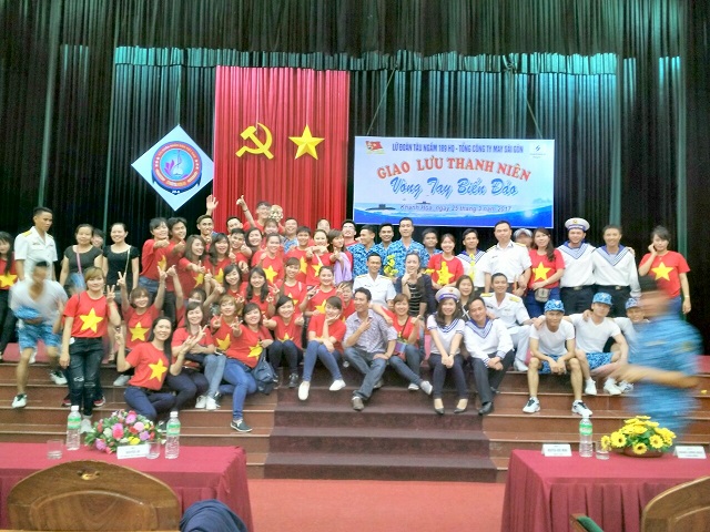 Đoàn viên thanh niên Lữ doàn 189 và Tổng Công ty may Sài Gòn chụp ảnh lưu niệm trong đêm gi...