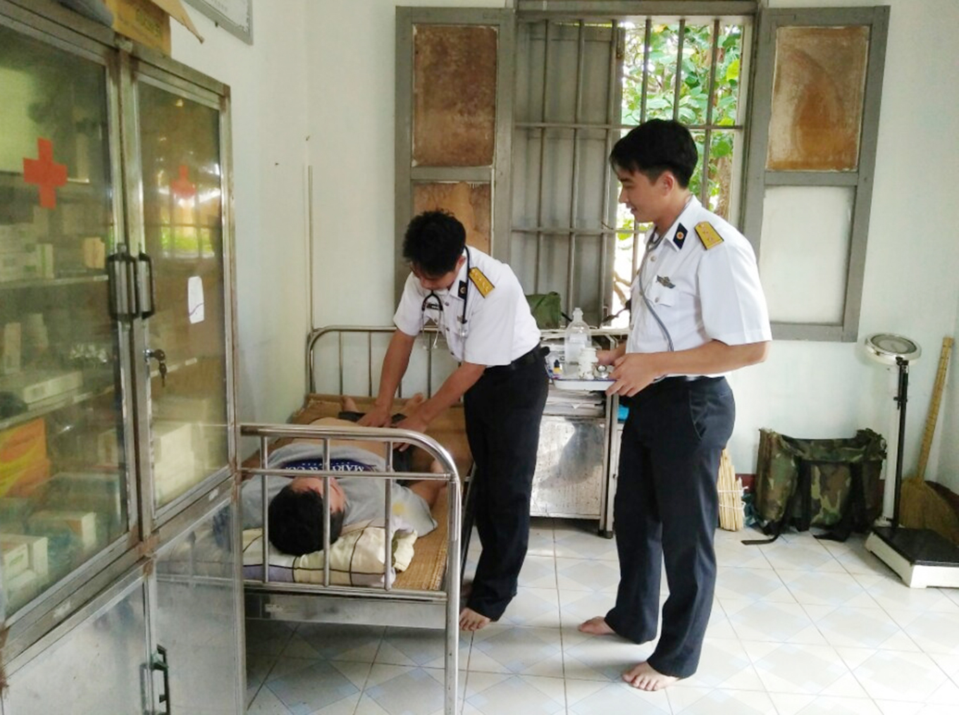 Bác sĩ Bệnh xá đảo Sinh Tồn thăm khám cho ngư dân Phan Nhựt Bệnh nhân Phan Nhựt có biểu hiện bị đau quặn bụng...