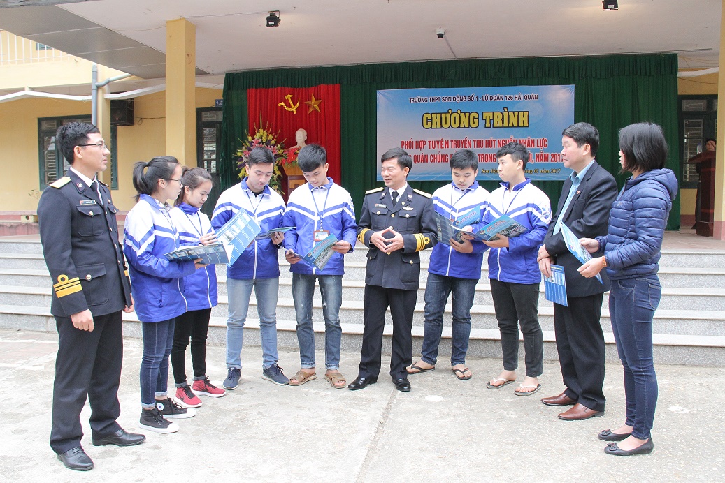 Thủ trưởng Lữ đoàn 126 trao đổi với thầy, trò trường THPT Sơn Động 1 Tại buổi tuyên truyền, các thầy, cô giáo...