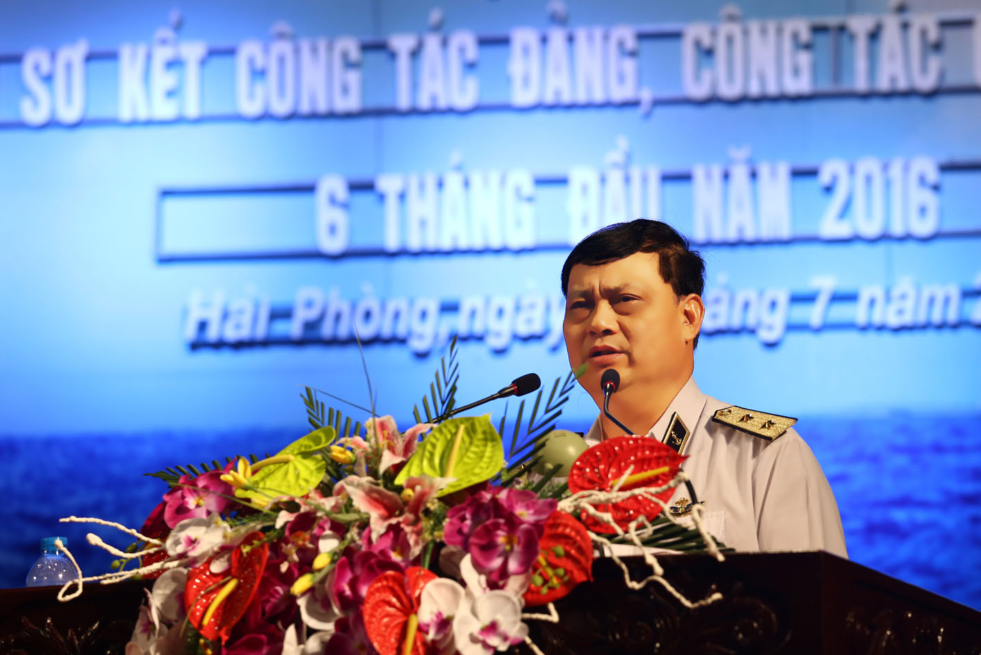 Phó đô đốc Đinh Gia Thật, Bí thư Đảng ủy, Chính ủy Hải quân phát biểu tại hội nghị Hoạt động CTĐ, CTCT của Qu...