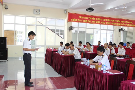Đại tá Nguyễn Túy, Phó chủ nhiệm Chính trị Hải quân phát biểu tại hội nghị. Tại Hội nghị, cán bộ, đản...