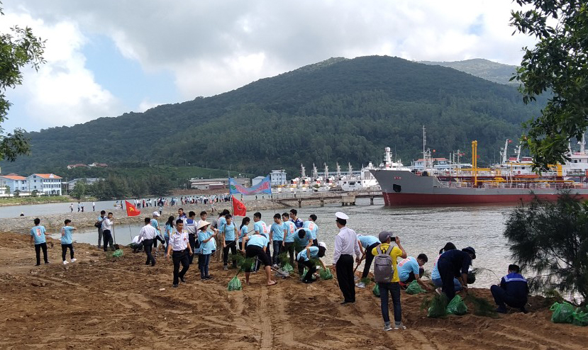 Các em học sinh và cán bộ, chiến sĩ Lữ đoàn đã trồng cây xanh phòng hộ, thu gom rác thải trên bờ biển.