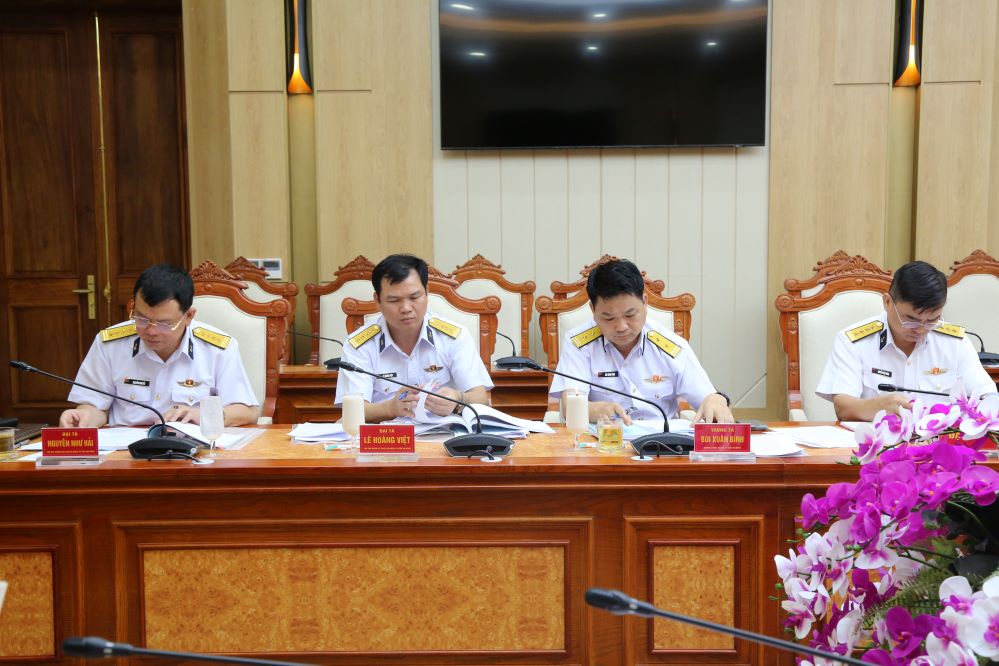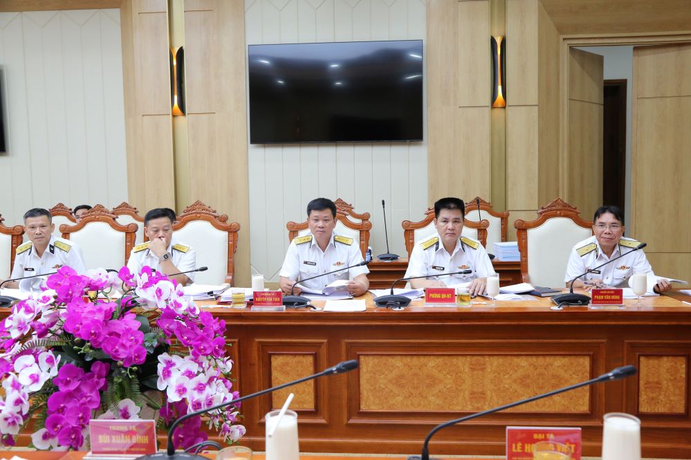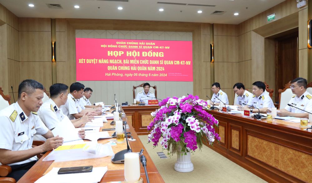 Sáng 6/6, tại Hải Phòng, Hội đồng chức danh sĩ quan chuyên môn- kỹ thuật- nghiệp vụ (CM-KT-NV) Quân chủng Hải quân tổ chức thẩm định, nâng ngạch, bãi miễn chức danh sĩ quan CM-KT-NV năm 2024. Chuẩn Đô đốc Phan Tuấn Hùng, Phó Tư lệnh, Chủ tịch Hội đồng chủ trì.