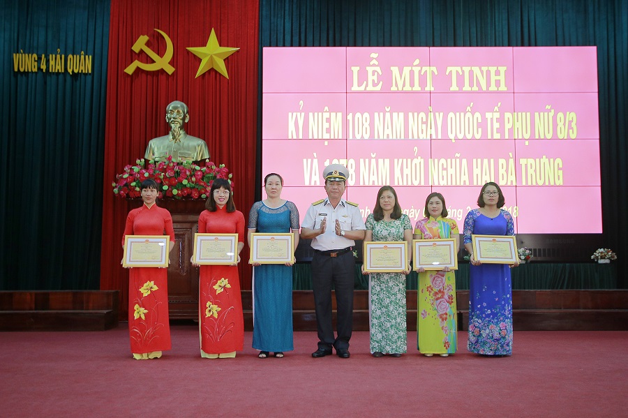 Sáng 7-3, tại TP. Cam Ranh, tỉnh Khánh Hòa, Vùng 4 Hải quân tổ chức Lễ mít tinh kỷ niệm 108 năm, Ngày Quốc tế phụ nữ 8-3 và 1978 năm khởi nghĩa Hai Bà Trưng. Đại tá Nguyễn Công Sơn, Phó Chính ủy Vùng 4 dự và chủ trì buổi lễ. Tham dự còn có đại diện cơ quan chính trị các đơn vị trực thuộc Vùng và 135 cán bộ, hội viên các Hội phụ nữ cơ sở Vùng.
