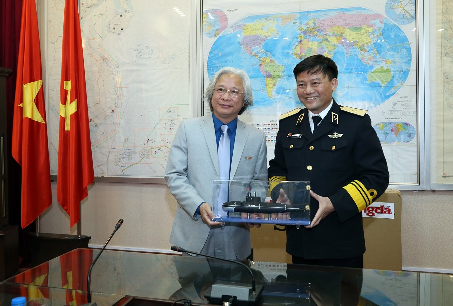 Chuẩn Đô đốc Phạm Văn Vững tặng đồng chí Nguyễn Văn Phú mô hình tàu ngầm Hải quân