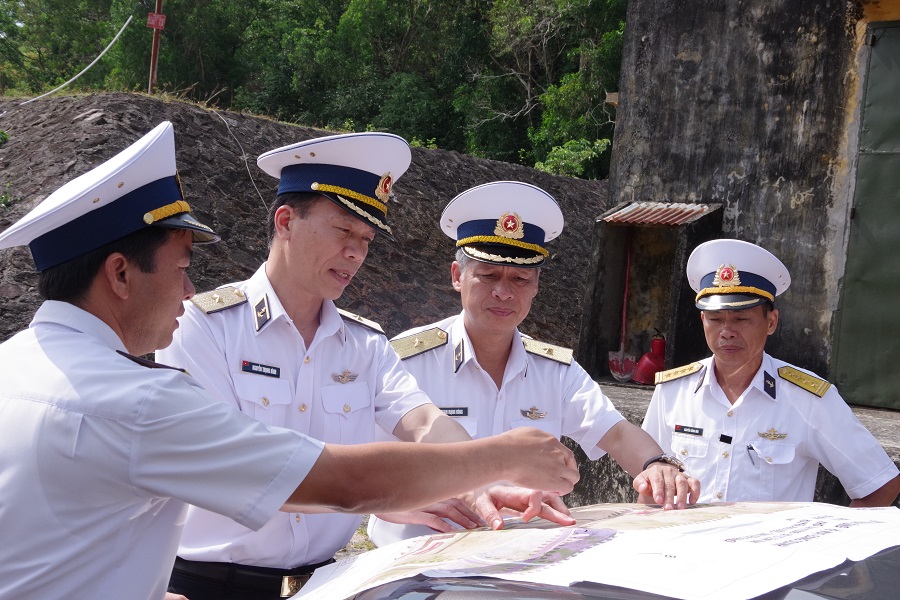 Chuẩn Đô đốc Nguyễn Trọng Bình kiểm tra sơ đồ quy hoạch doanh trại Vùng 5 Hải quân