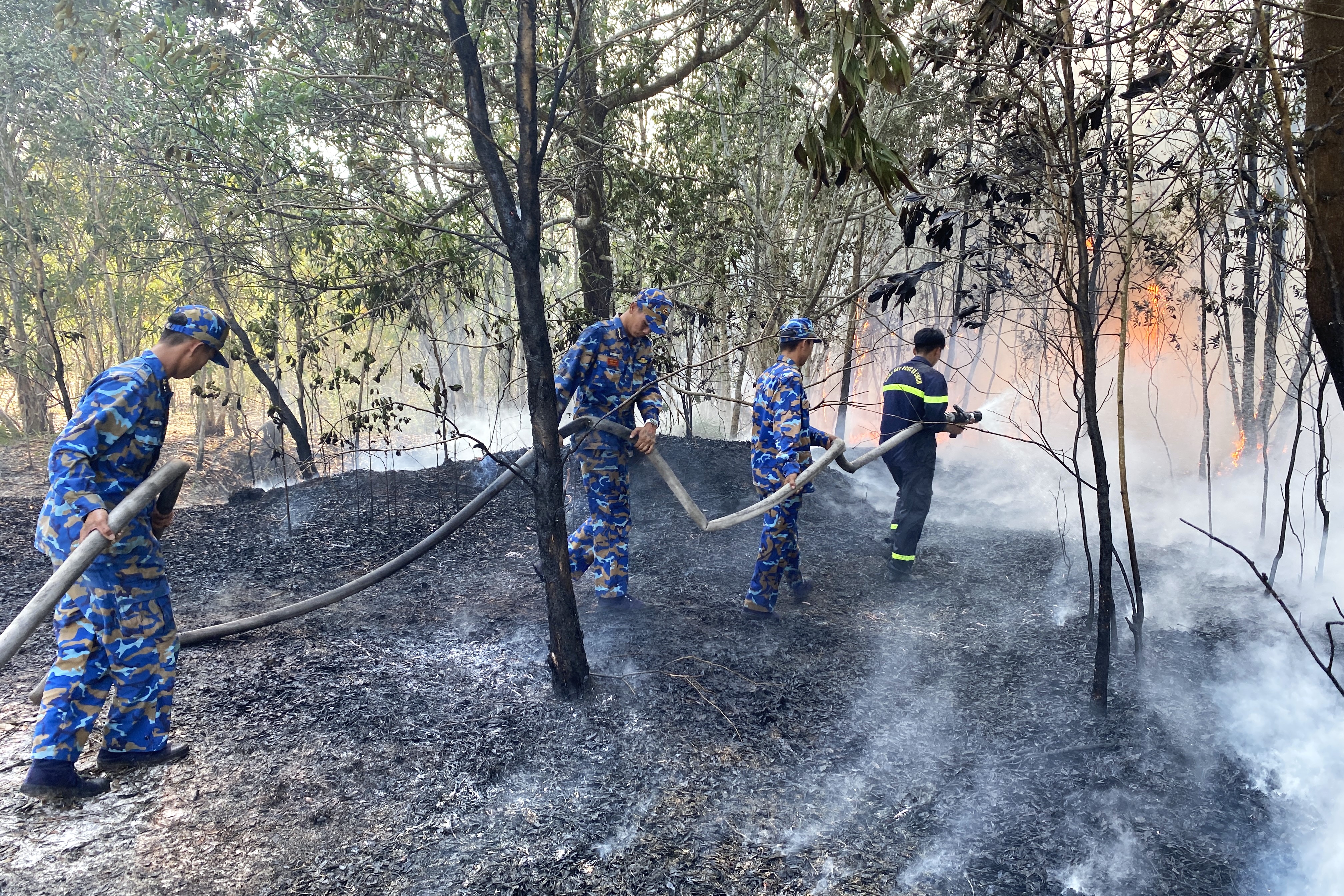 Cán bộ, chiến sĩ tích cực dập lửa, khống chế đám cháy