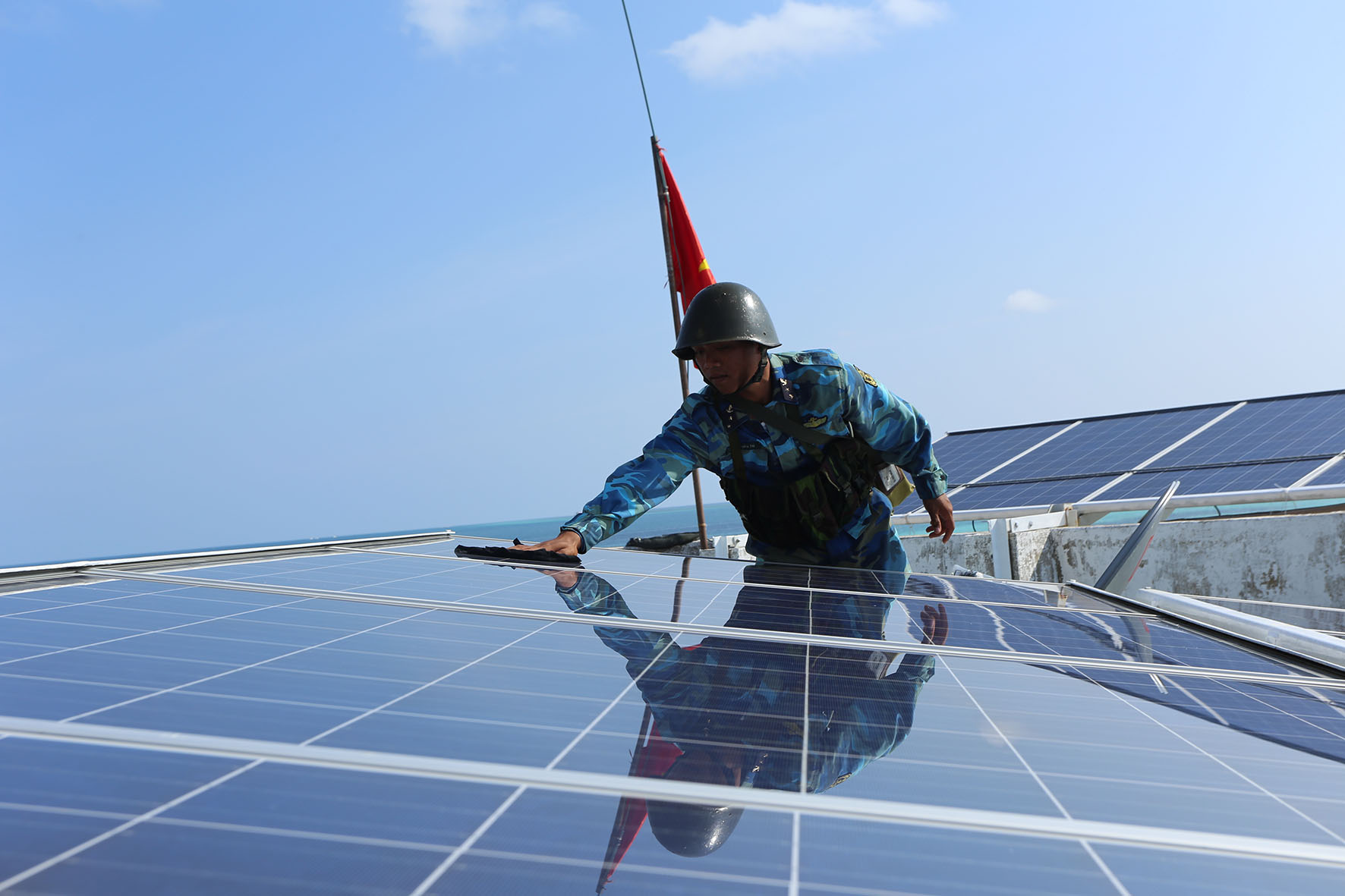 Sau giờ huấn luyện, chiến sĩ đảo Núi Le tranh thủ quản bảo pin năng lượng mặt trời