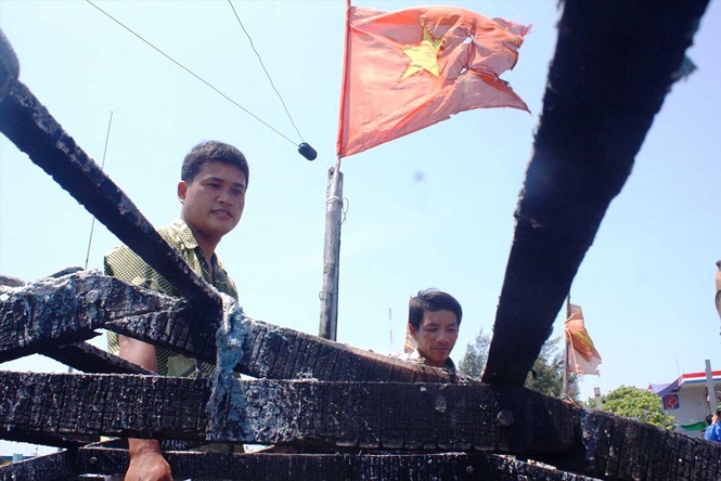 Bùi Văn Phải và đồng nghiệp Phạm Quang Thạnh trên con tàu QNg 96382 TS bị tàu Trung Quốc bắn cháy giữa Hoàng Sa ngày 20-3-2013. Ảnh: Lê Văn Chương