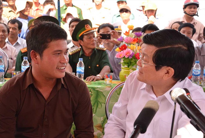 Chủ tịch nước Trương Tấn Sang trong chuyến thăm và làm việc tại Lý Sơn ngày 15-4-2013 đã trò chuyện, động viên thuyền trưởng Bùi Văn Phải. Ảnh: Lê Văn Chương