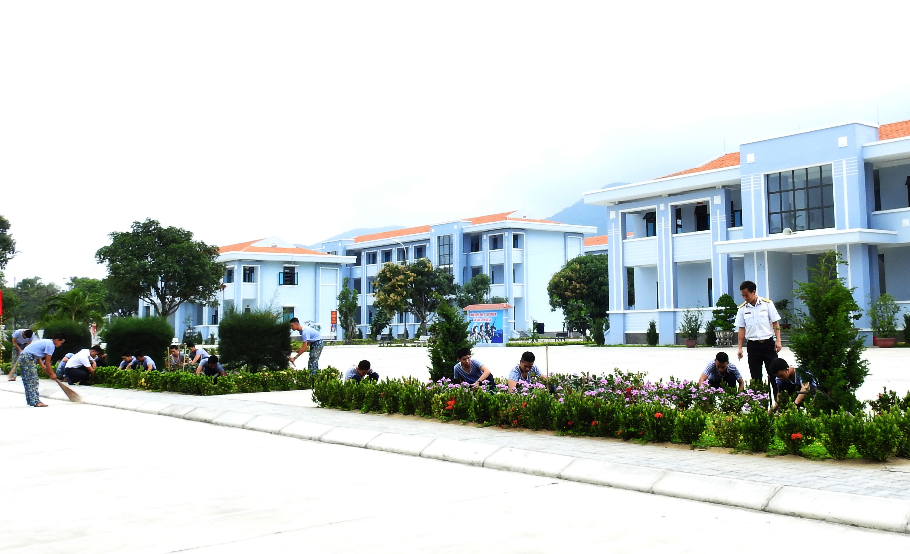 Cán bộ, đoàn viên Lữ đoàn lao động làm đẹp khuôn viên đơn vị