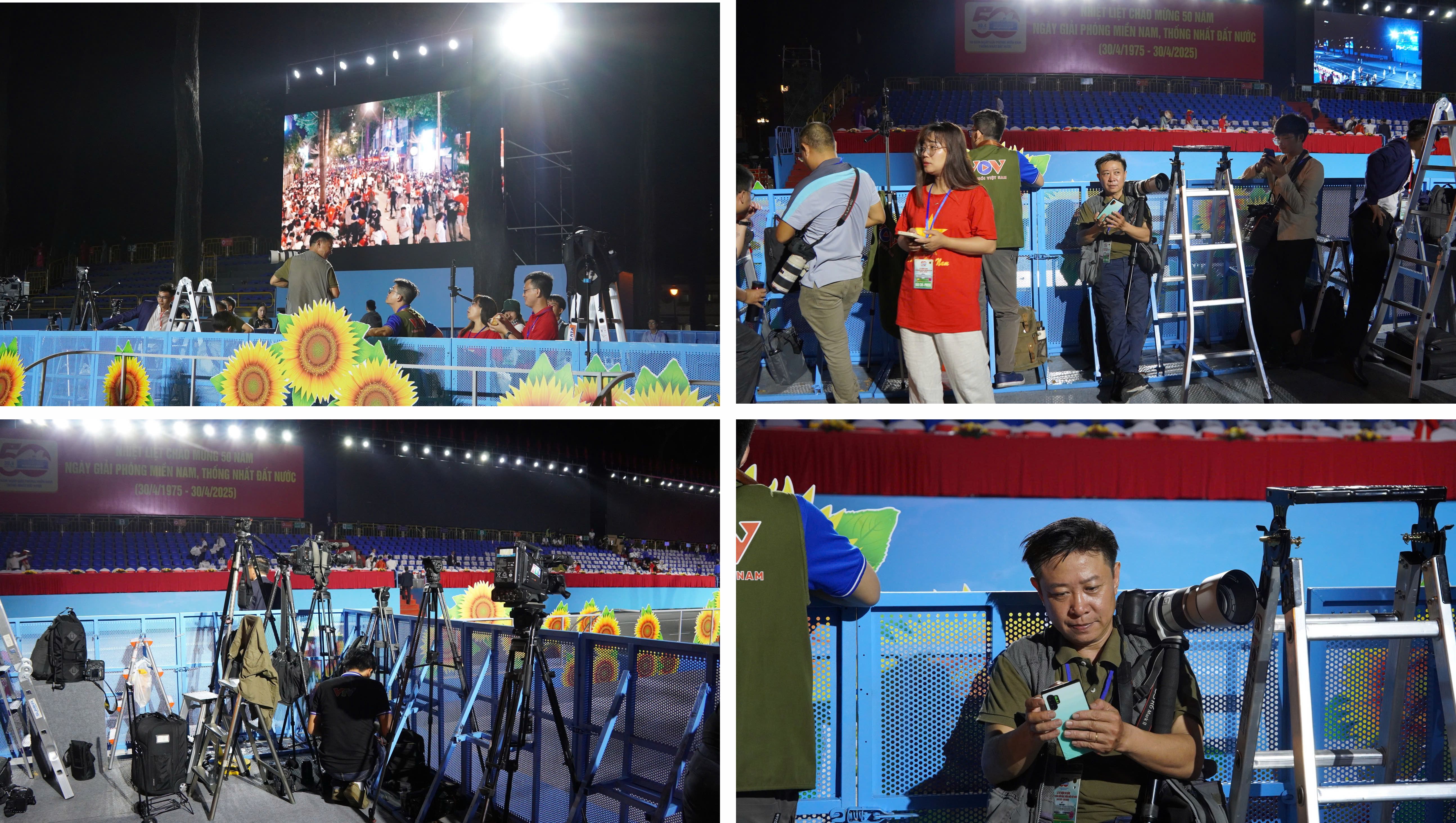 Từ lúc 3 giờ sáng, những nhóm phóng viên đã có mặt tại các vị trí được phân công, mang theo đầy đủ thiết bị: máy ảnh, máy quay, laptop, pin sạc dự phòng, ống kính tele, bộ phát wifi di động… và cả những vật dụng "đặc thù nghề nghiệp" như ghế gấp, giá đỡ, thậm chí cả… thang nhôm để có thể ghi hình ở vị trí trên cao, bao quát toàn cảnh sự kiện...