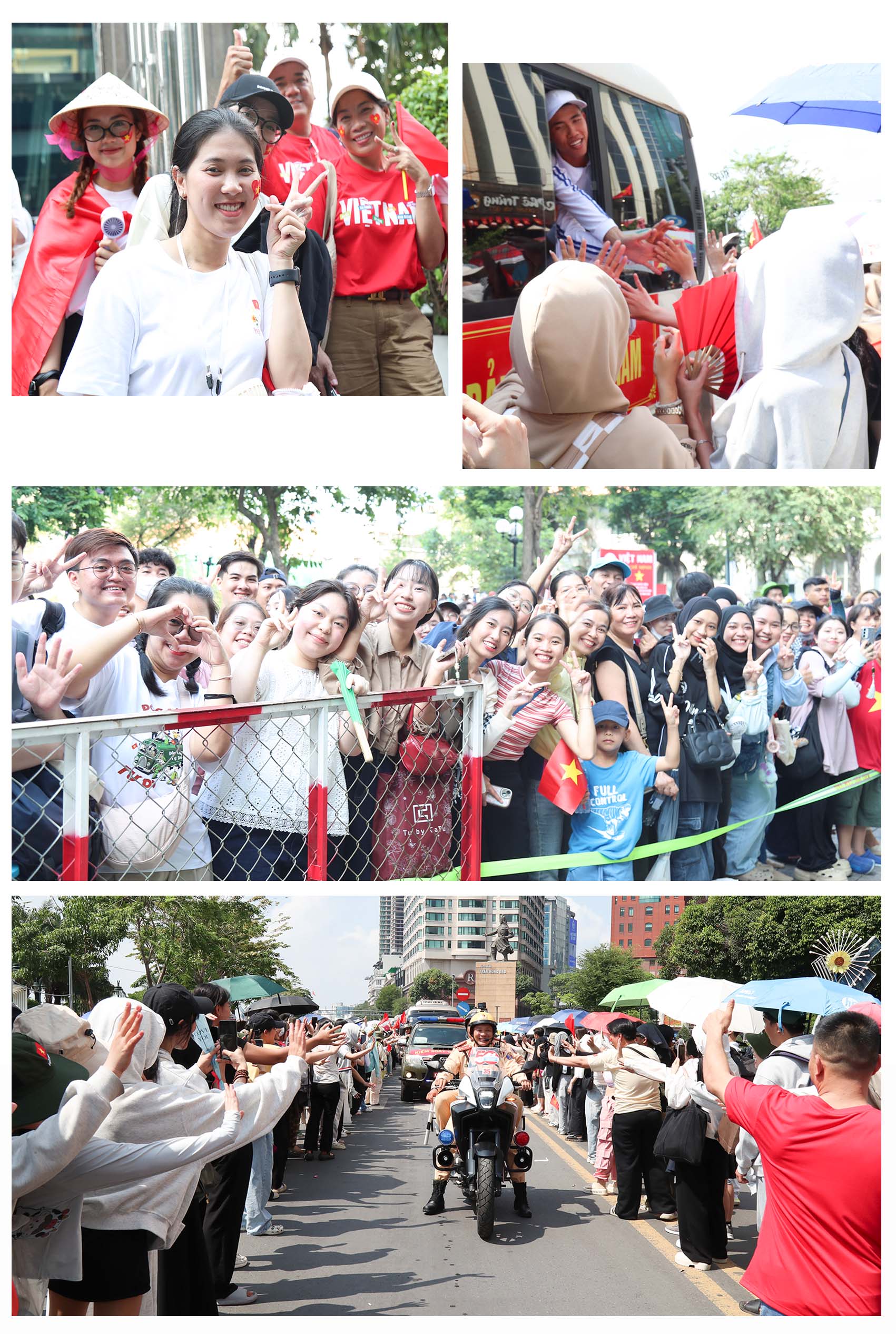 Có người mặc áo cờ đỏ sao vàng, có em nhỏ vẫy cờ liên tục trong tiếng nhạc hùng tráng. Những tràng pháo tay, tiếng reo vang khi các đoàn xe, đoàn quân xuất hiện...