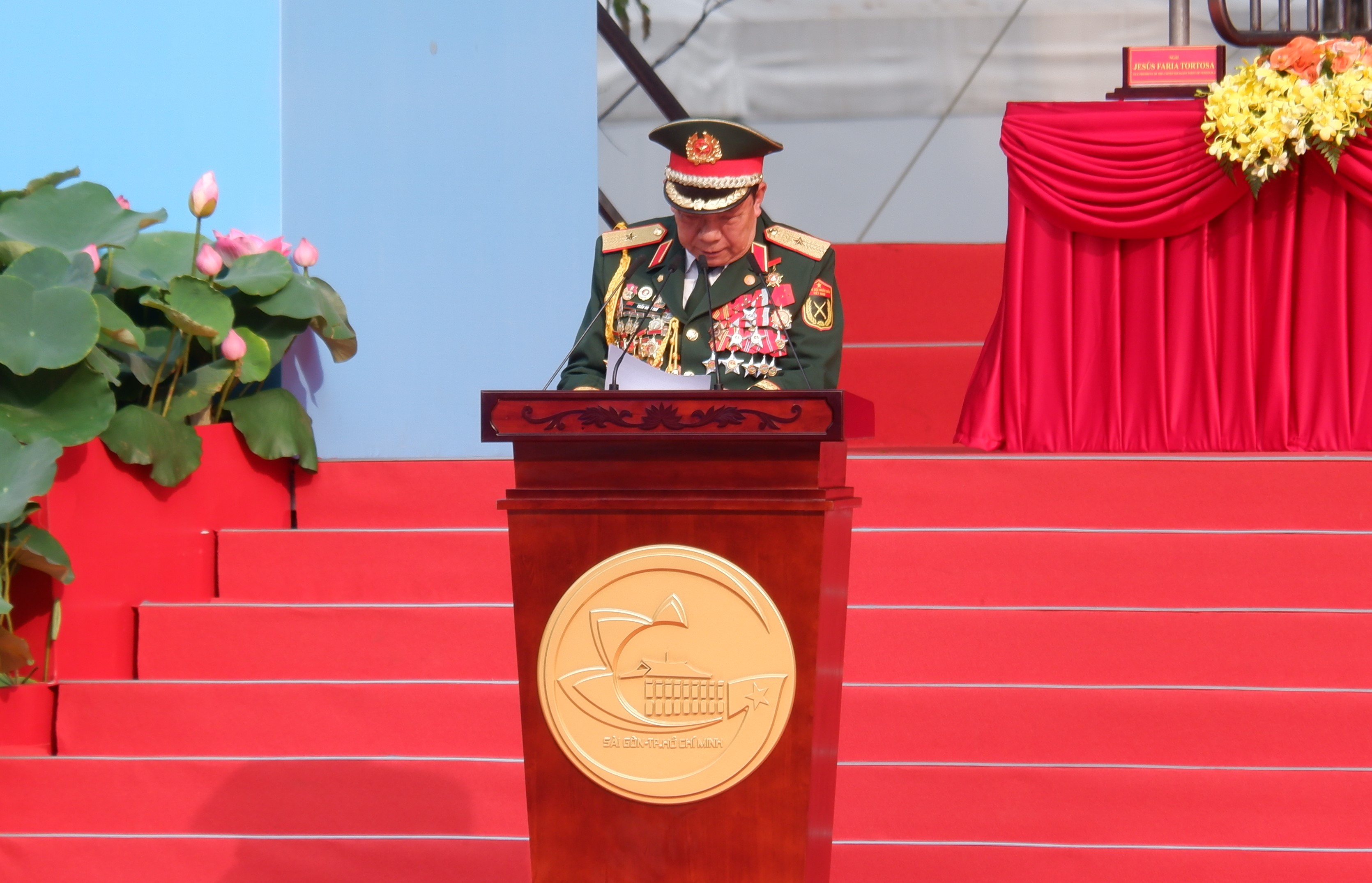 Đồng chí Thiếu tướng Trần Ngọc Thổ, đại diện lực lượng tham gia chiến dịch Hồ Chí Minh lịch sử phát biểu