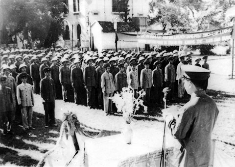 Đại tướng Võ Nguyên Giáp - Tổng Tư lệnh QĐND Việt Nam đọc quyết định thành lập hai thủy đội Sông Lô, Bạch Đằng tại buổi mít tinh ngày 24-8-1955. Ảnh: Tư liệu