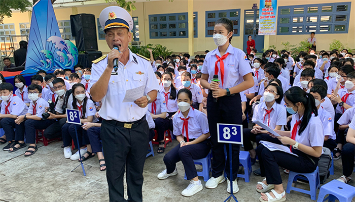 Cán bộ Học viện Hải quân chia sẻ thông tin về biển, đảo cho học sinh Trường THCS Thái Nguyên, TP. Nha Trang, tỉnh Khánh Hòa