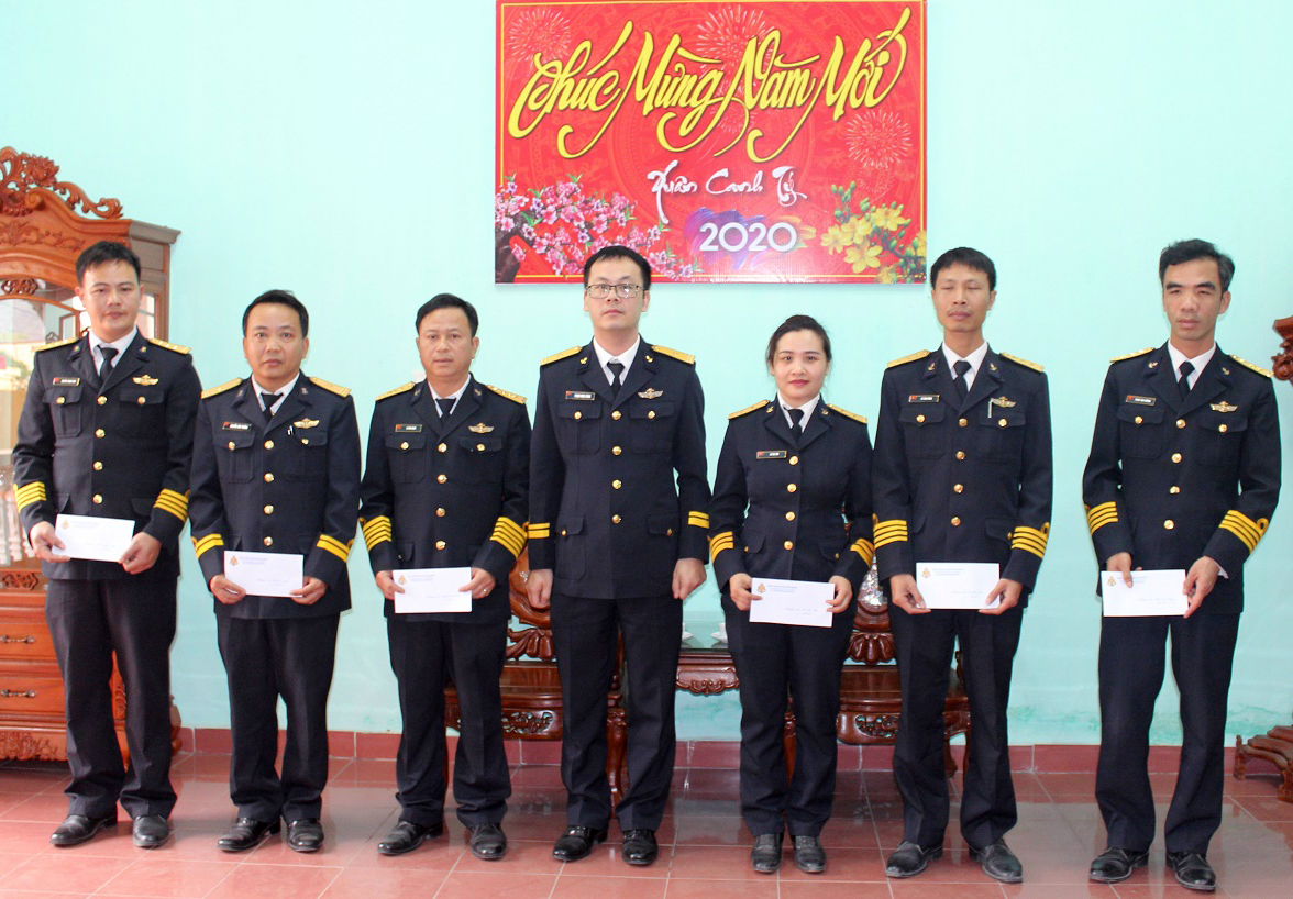 Trưởng ban Công đoàn Hải quân đã tặng quà, gửi lời chúc mừng năm mới đến Đảng ủy, chỉ huy Kho 703 và tặng 6 phần quà trị giá 4 triệu đồng cho 6 cán bộ, đoàn viên công đoàn nhân dịp năm mới 2020.