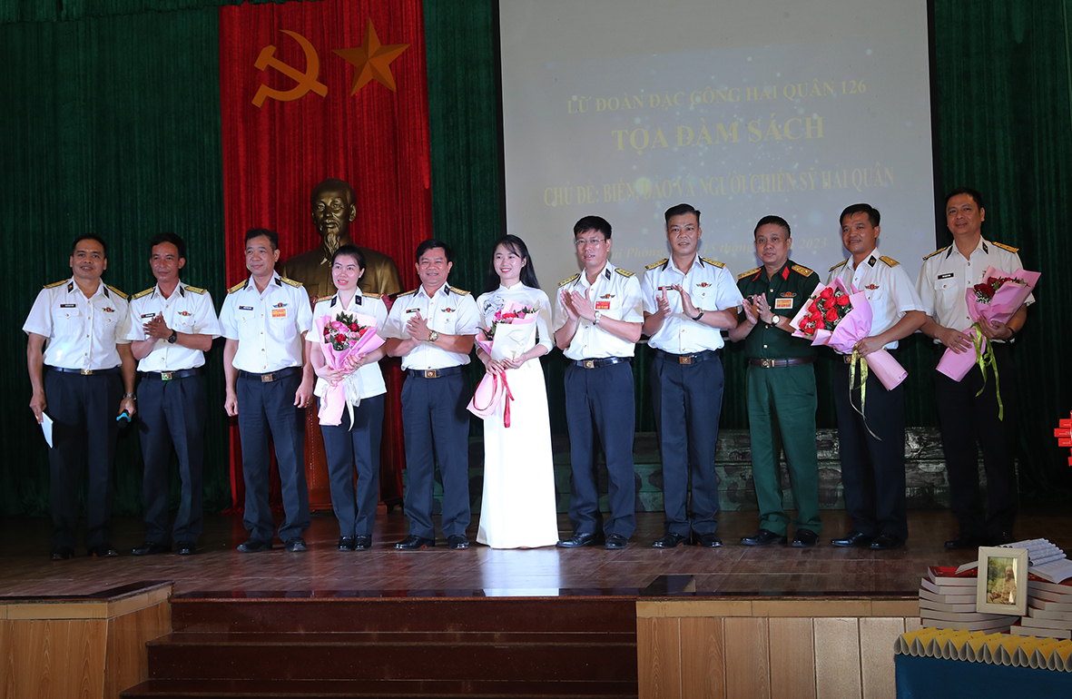 Chỉ huy Lữ đoàn 126 tặng hoa chúc mừng các diễn giả tham gia buổi tọa đàm sách