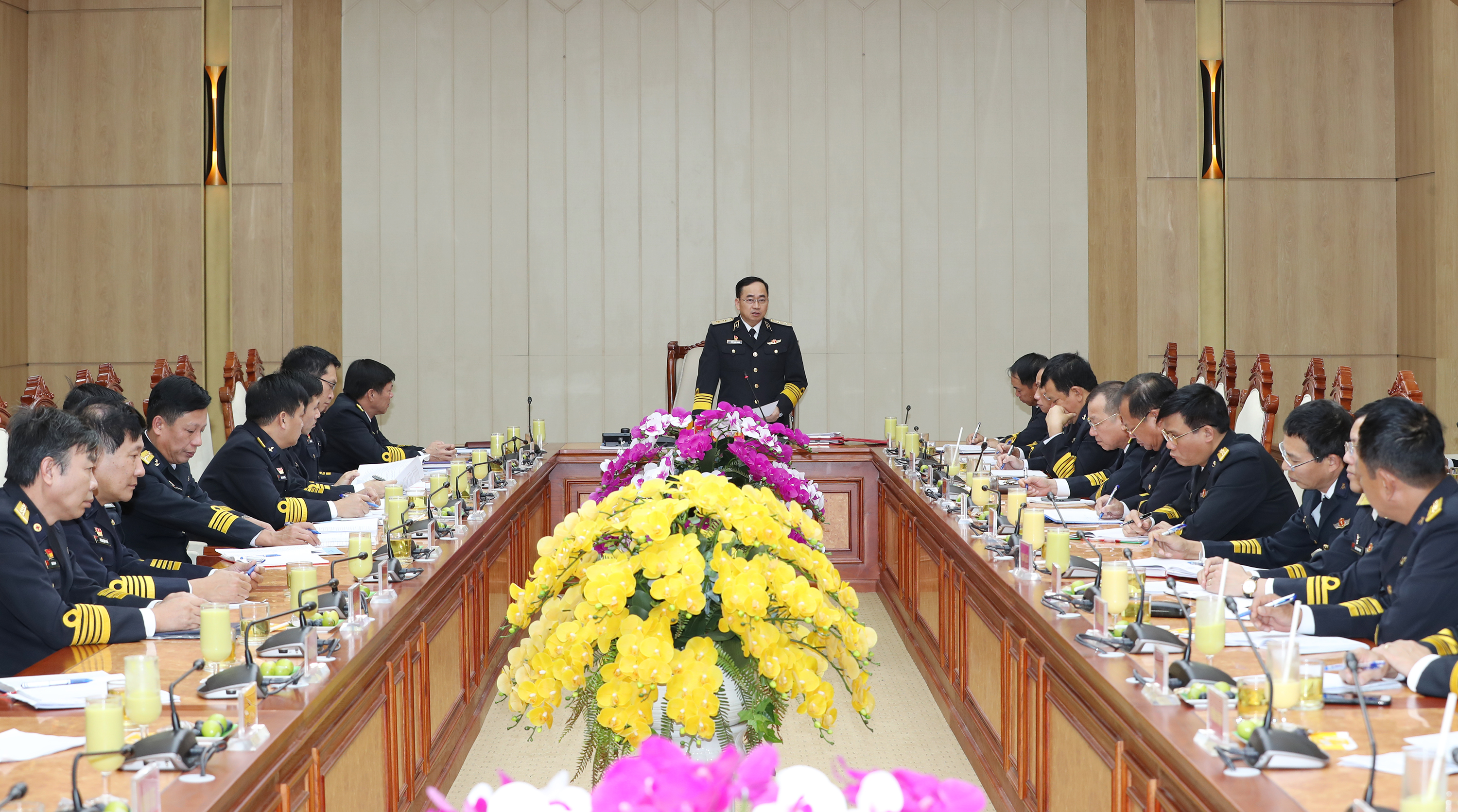 Phát biểu chỉ đạo hội nghị, Phó Đô đốc Trần Thanh Nghiêm chúc mừng Chuẩn Đô đốc Đỗ Quốc Ân và Đại tá Lê Hồng Quang vừa được bổ nhiệm chức vụ mới.