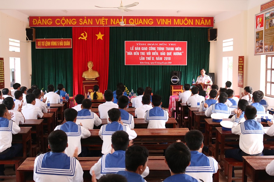 Sáng 2-2, tại huyện đảo Phú Quốc, tỉnh Kiên Giang, Tỉnh đoàn Bến Tre đã tổ chức Lễ bàn giao công trình thanh niên “Dừa Bến Tre với biển, đảo quê hương” cho Vùng 5 Hải quân. Dự lễ bàn giao có đồng chí Hà Văn Cường, Phó Bí thư Thường trực Tỉnh đoàn và Đại tá Nguyễn Đăng Tiến, Phó Chính ủy Vùng 5 Hải quân.