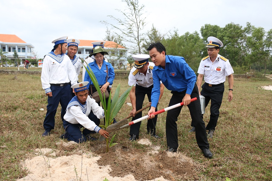 Các đại biểu trồng cây dừa trong khuôn viên Hải đội 512, Lữ đoàn 127, Vùng 5 Hải quân