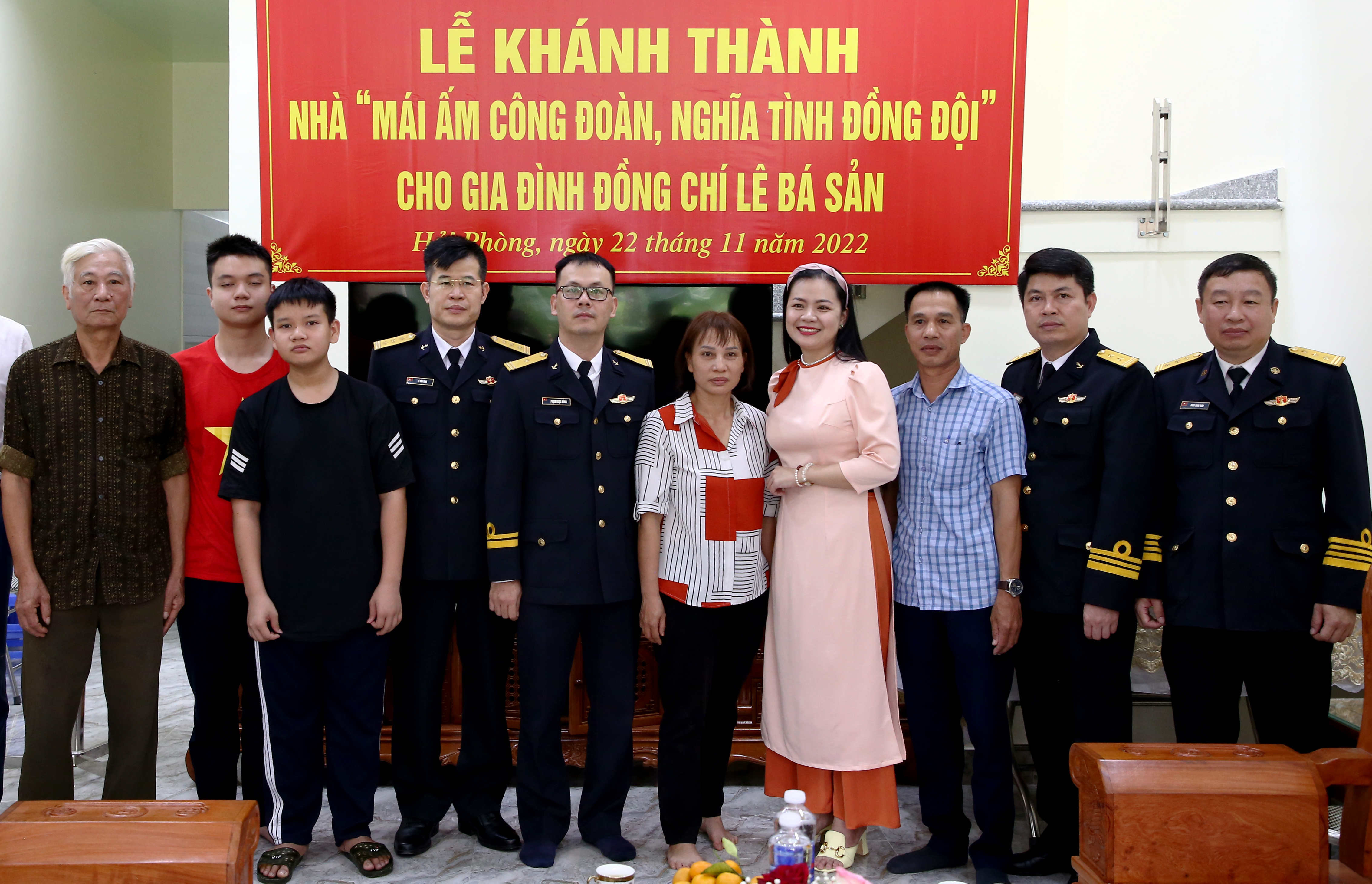 Chiều 22/11, tại thôn Lương Quán, xã Nam Sơn, huyện An Dương, TP.Hải Phòng, thừa ủy quyền của Cục Chính trị Hải quân, Phòng Công tác quần chúng phối hợp với Phòng Chính trị Bộ Tham mưu, Lữ đoàn 602 và chính quyền địa phương tổ chức khánh thành và bàn giao nhà “Mái ấm công đoàn, nghĩa tình đồng đội” tặng gia đình Thiếu tá QNCN Lê Bá Sản.