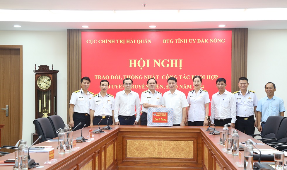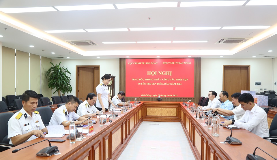 Chiều 15/9, tại Hải Phòng, Cục Chính trị Hải quân và Ban Tuyên giáo Tỉnh ủy Đắk Nông tổ chức Hội nghị trao đổi, thống nhất công tác phối hợp tuyên truyền biển, đảo năm 2024. Chuẩn Đô đốc Phạm Văn Luyện, Phó Chủ nhiệm Chính trị Hải quân và đồng chí Bùi Huy Thành, Trưởng ban Tuyên giáo Tỉnh ủy Đắk Nông đồng chủ trì.