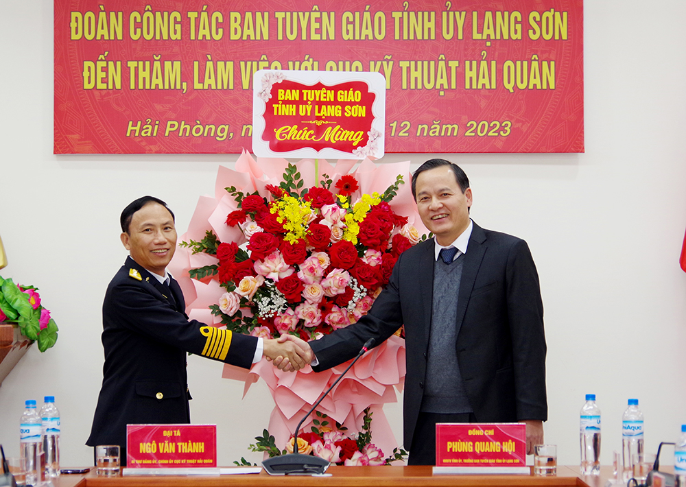Chiều 20/12, tại Hải Phòng, đoàn công tác của Ban Tuyên giáo Tỉnh ủy Lạng Sơn do đồng chí Phùng Quang Hội, Trưởng ban Tuyên giáo Tỉnh ủy đã đến thăm và chúc mừng Cục Kỹ thuật Hải quân nhân dịp kỷ niệm 79 năm Ngày thành lập Quân đội nhân dân Việt Nam. Đại tá Ngô Văn Thành, Bí thư Đảng ủy, Chính ủy Cục Kỹ thuật Hải quân chủ trì tiếp đoàn.