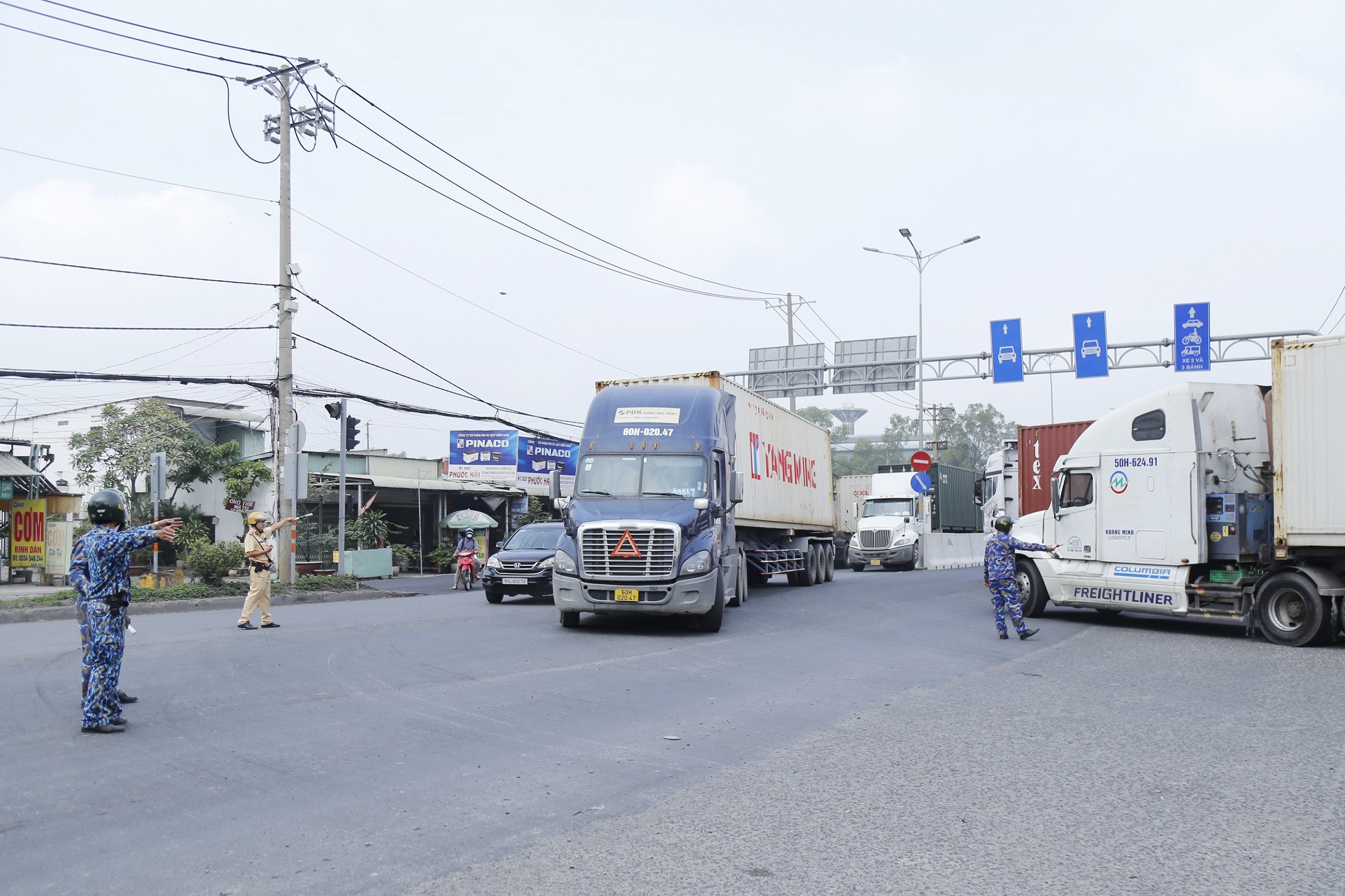 Lực lượng Cảnh sát giao thông và Trung tâm an ninh cảng Tân cảng Cát Lái điều tiết phân luồng phương tiện ra vào cảng