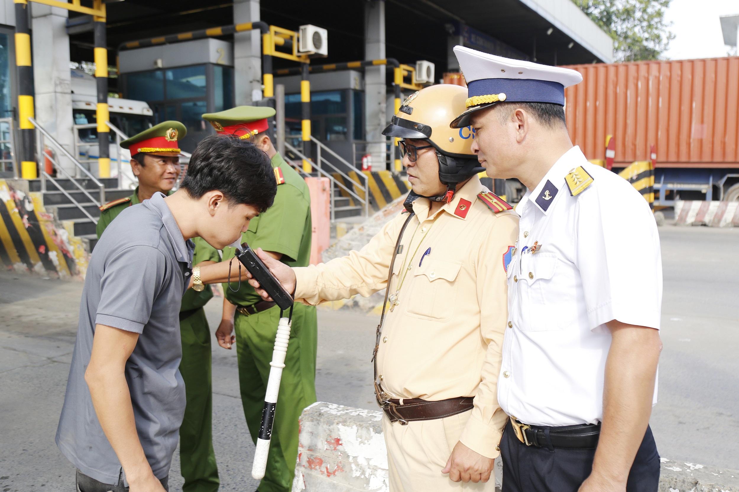 Sáng 31/12, tại TP. Hồ Chí Minh, Tổng công ty Tân cảng Sài Gòn phối hợp với Công an TP. Hồ Chí Minh, Công an TP. Thủ Đức và lực lượng Biên phòng cửa khẩu, Hải quan cửa khẩu tiến hành kiểm tra hung khí, vật liệu nổ, công cụ hỗ trợ và kiểm tra nồng độ cồn đối với lái xe, phụ xe ra vào cụm cảng Tân cảng Cát Lái.