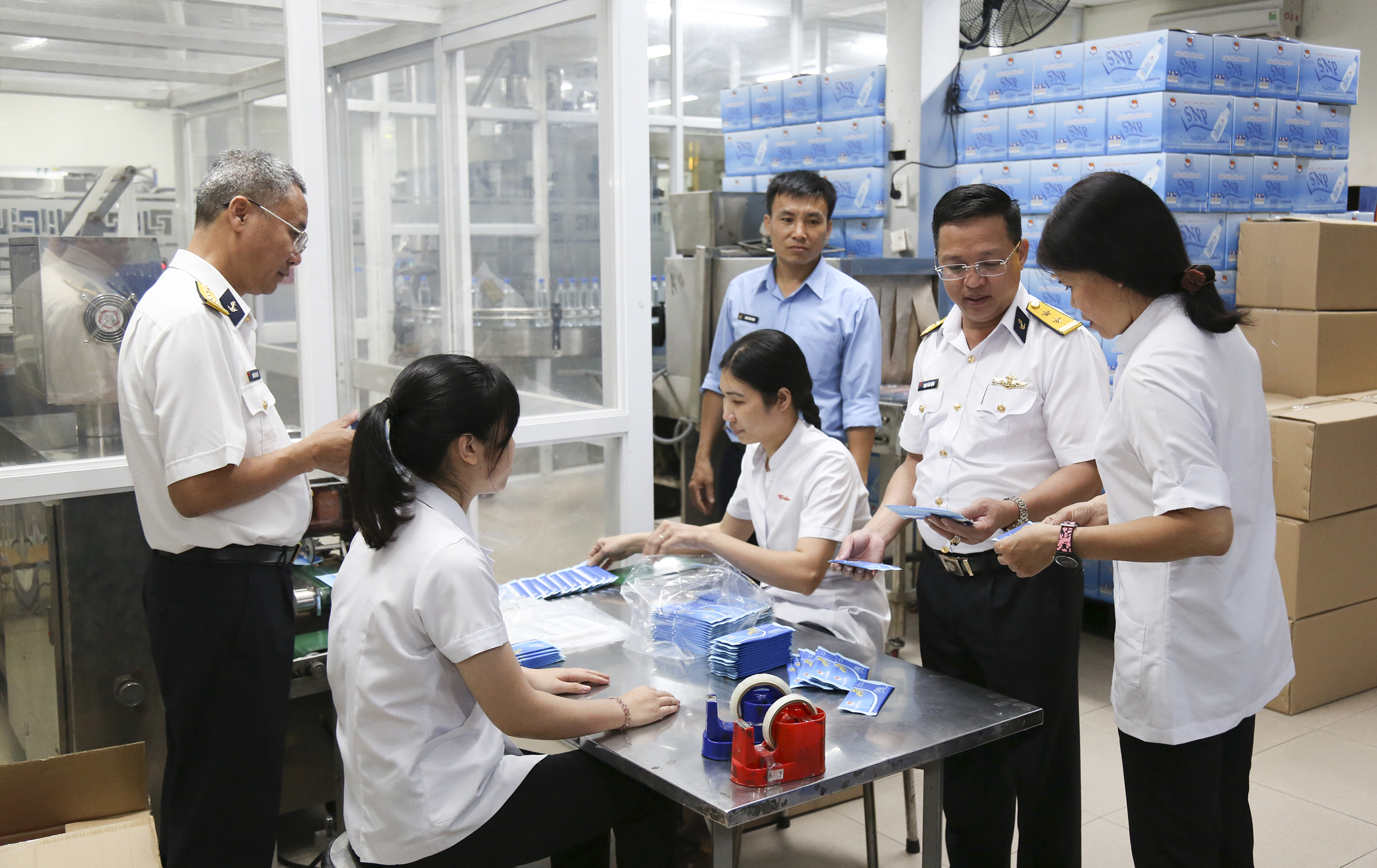 Thủ trưởng Phòng Hậu cần kiểm tra dây chuyền sản xuất nước đóng chai tại Xưởng sản xuất nước uống của TCT