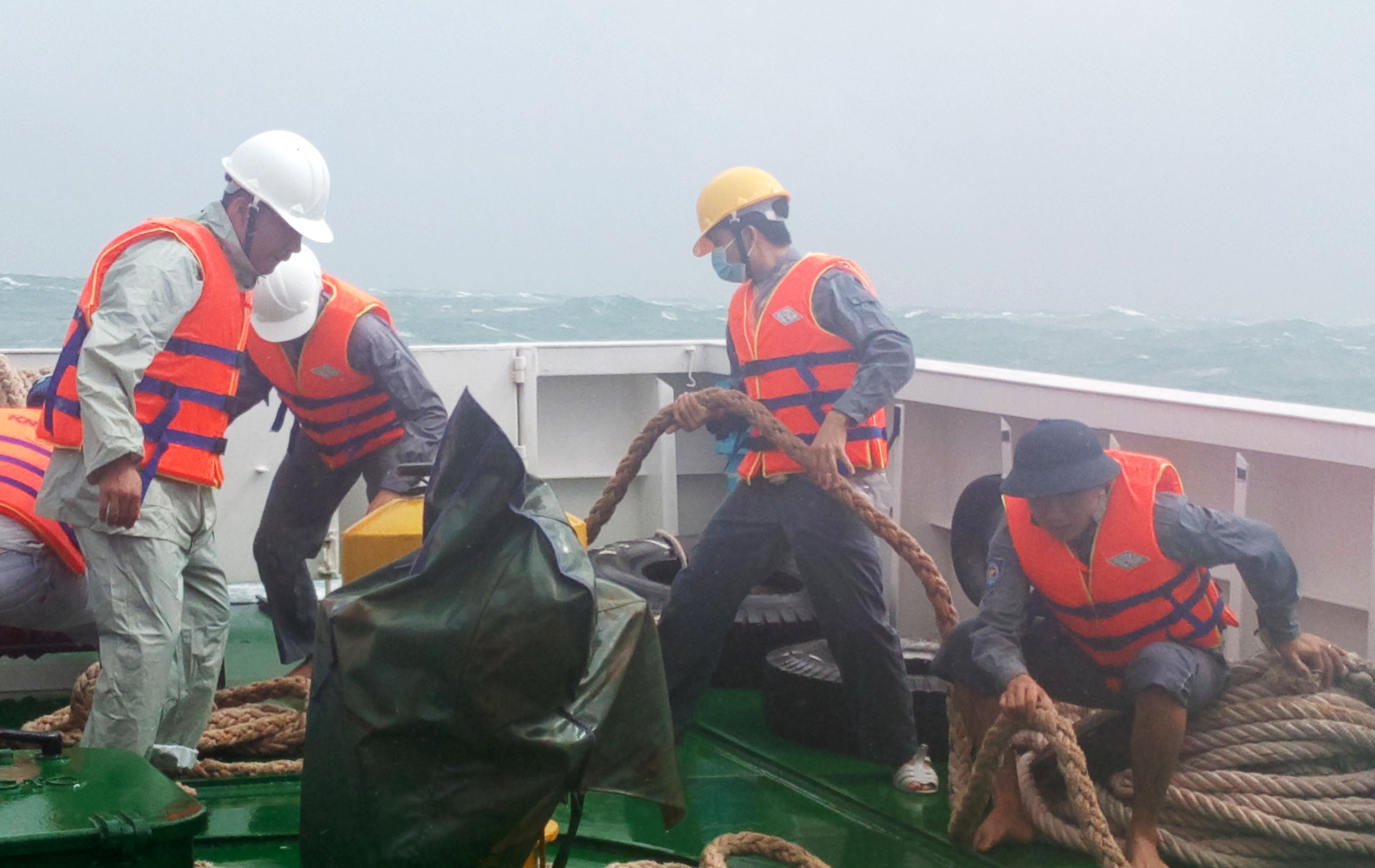 Cán bộ, nhân viên Tàu KN 269, Chi đội Kiểm ngư số 2 triển khai làm dây kéo tàu cá bị nạn vào bờ