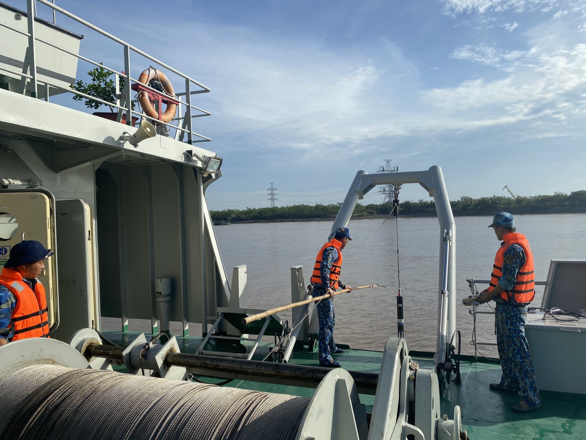 Cán bộ, nhân viên Đoàn Đo đạc biên vẽ hải đồ và nghiên cứu biển thao tác thả máy đo đa tia