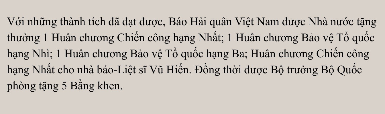 Thượng tá, nhà báo Nguyễn Trọng Thiết, Phó Tổng Biên tập Báo Hải quân chia sẻ: Có những phóng viên của báo chúng tôi từng tác nghiệp liên tục hơn 100 ngày trên trên biển, máy móc bị lỗi kỹ thuật do tác động của khí hậu khắc nghiệt, nước biển mặn nhưng chưa ai bỏ cuộc. Vì mỗi tác phẩm là một phần của cuộc chiến giữ vững chủ quyền.