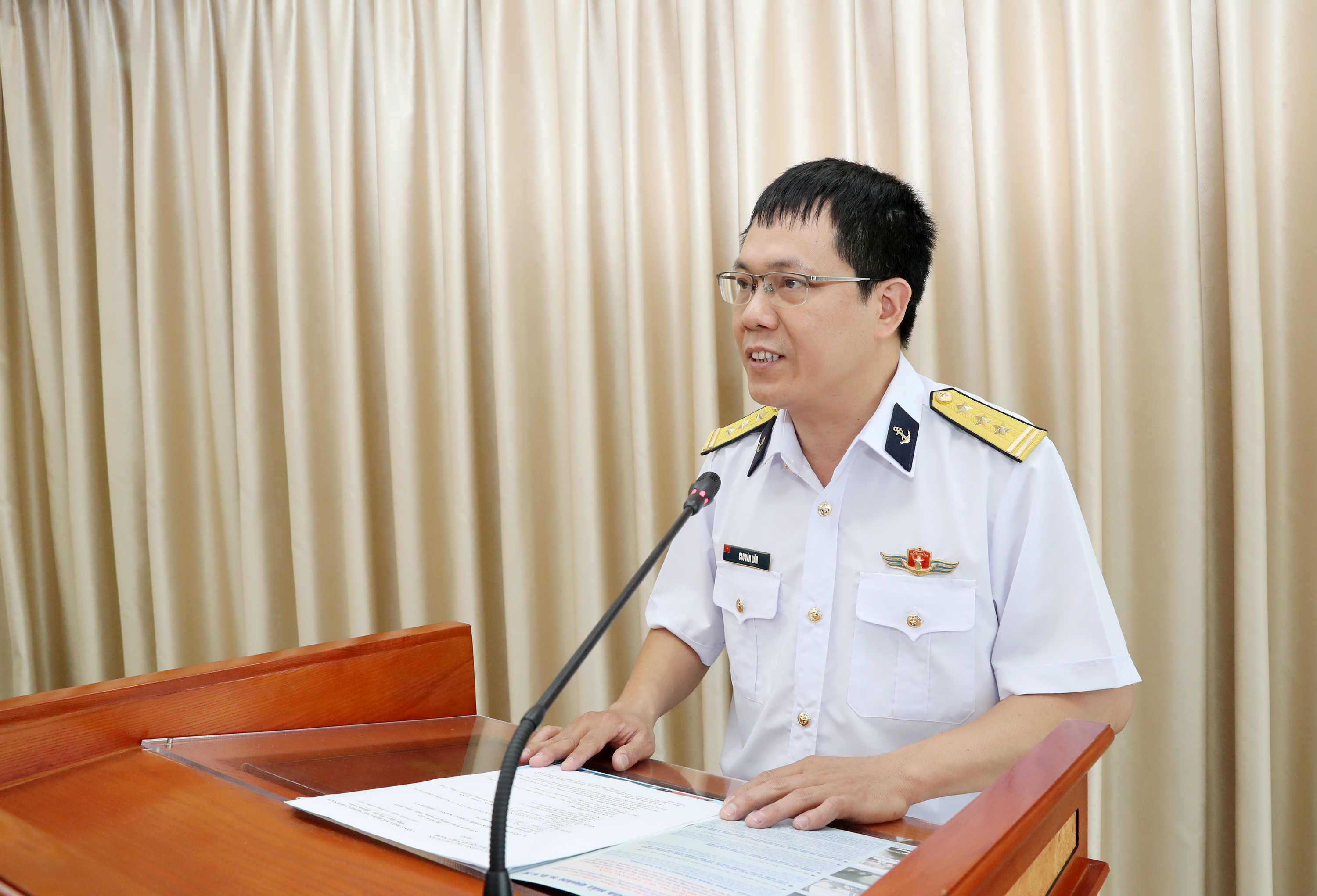 Thượng tá Cao Văn Dân báo cáo kết quả hoạt động của Báo Hải quân Việt Nam 6 tháng đầu năm 2025