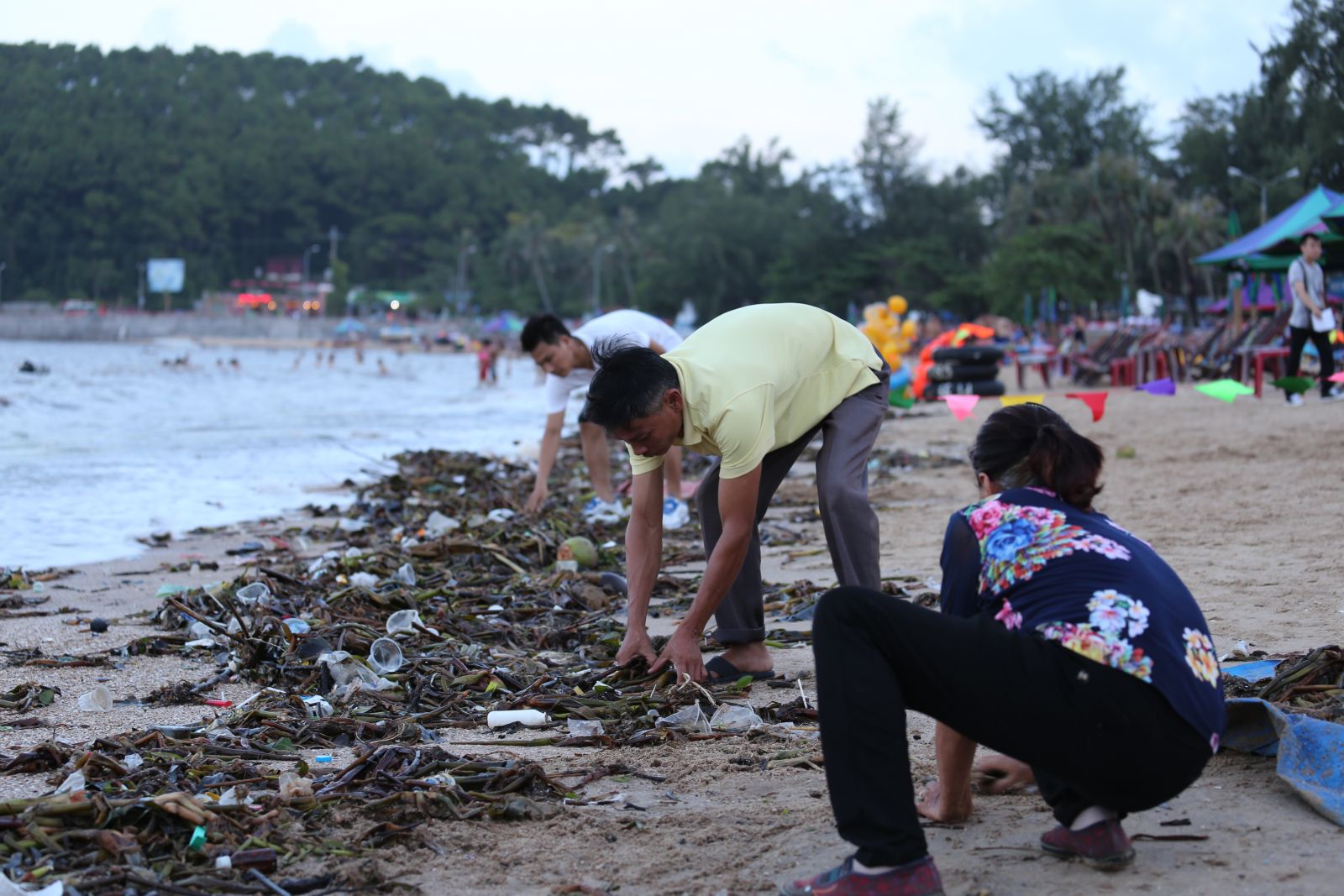 Người dân Đồ Sơn, Hải Phòng thu dọn rác thải trên bãi biển mỗi khi thủy triều lên. Ảnh: Thanh Thủy