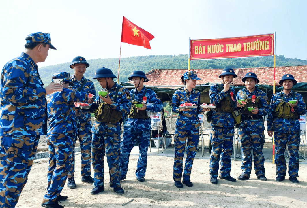 Cán bộ, hội viên Hội phụ nữ Trung tâm đã tranh thủ thời gian nghỉ giải lao để trò chuyện, động viên, trao những ly nước mát, phần quà là trái cây đến tận tay cán bộ, chiến sĩ và giao lưu văn nghệ tạo không khí vui tươi, sôi nổi sau những giờ luyện tập.