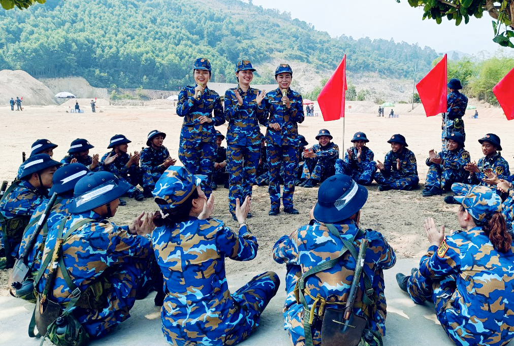 Phút giải lao trên thao trường của chiến sĩ với các hội viên hội phụ nữ