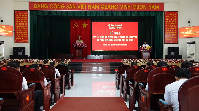 Chiều 9/9, tại Học viện Hải quân (TP. Nha Trang, tỉnh Khánh Hòa) Cục Nhà trường, Bộ Tổng Tham mưu tổ chức bế mạc lớp bồi dưỡng và cấp chứng chỉ nghiệp vụ sư phạm cho giảng viên Học viện Hải quân năm 2022.
