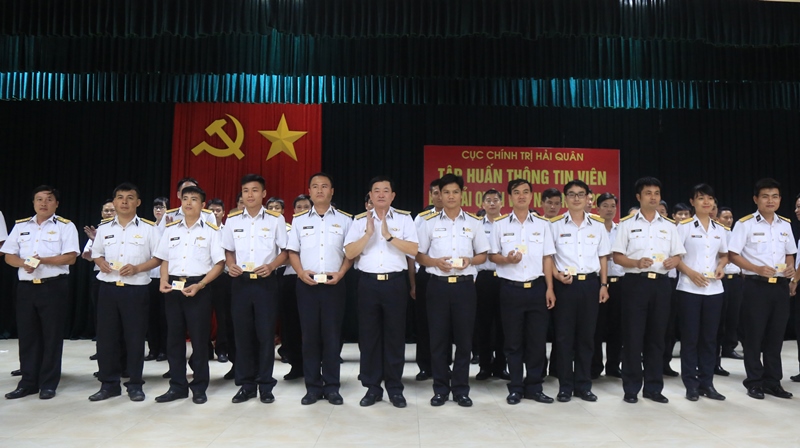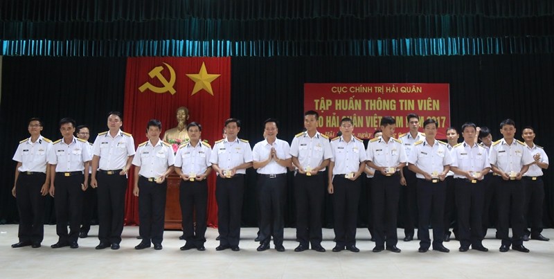 Chuẩn Đô đốc Đoàn Văn Chiều tặng Giấy khen của Cục Chính trị Hải quân cho các đồng chí có thành tích tốt trong Tập huấn Thông tin viên Báo Hải quân Việt Nam năm 2017