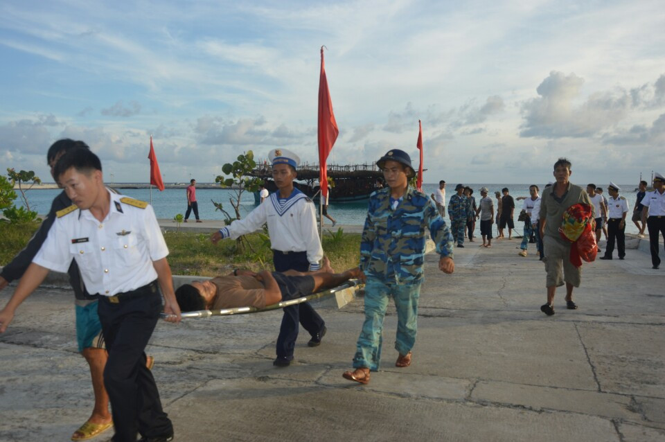 Cán bộ, chiến sĩ đảo Sinh Tồn vận chuyển ngư dân Đặng Kiên vào bệnh xá cấp cứu
