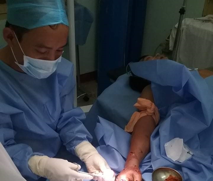 Do bất cẩn khi vận hành máy xay đá trên tàu, Ngư dân Lục Văn Nga đã bị máy xay đá nghiền dập lòng bàn tay phải, gãy nát ngón tay giữa, gãy hai xương cảng tay. Các y, bác sĩ Bệnh xá đảo Sinh Tồn đã tiến hành cầm máu, lọc vết thương, khử trùng, cố định và băng bó.