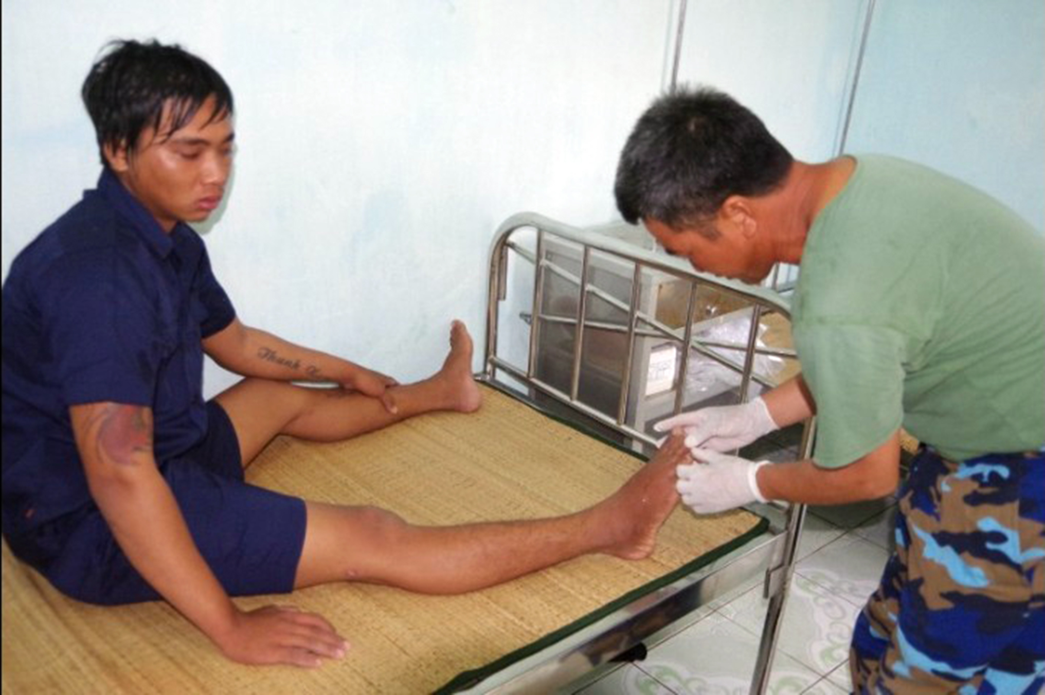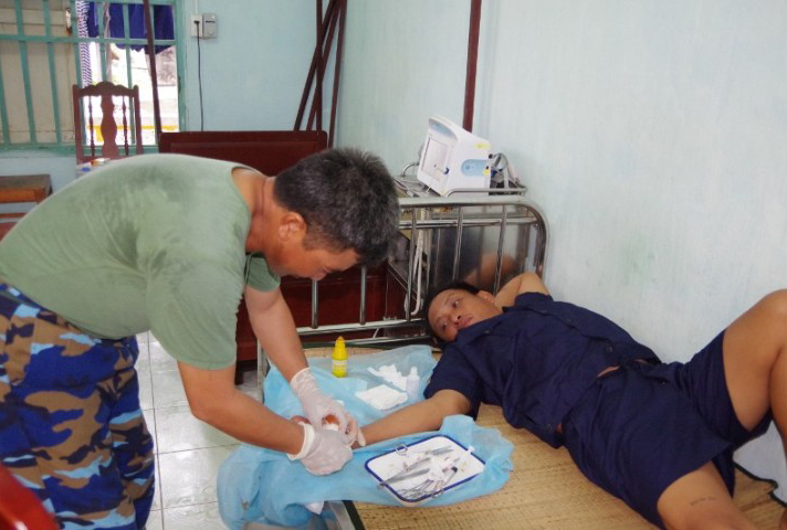 Bệnh nhân Võ Văn Tâm được bác sĩ Bệnh xá đảo Sơn Ca xử lý vết thương