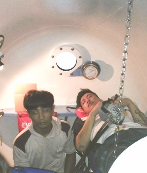 Bệnh nhân Triệu (người bên phải ảnh) trong buồng giảm áp