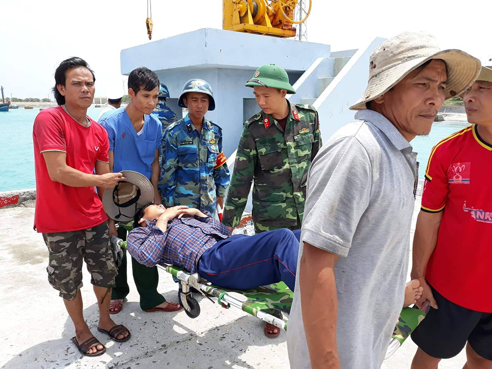 Lúc 10 giờ 30 phút cùng ngày, anh Hồ Chánh Hiệu, ngư dân tàu cá BĐ 96968 TS được đưa vào Bệnh xá đảo cấp cứu trong tình trạng bị thương ở đầu.