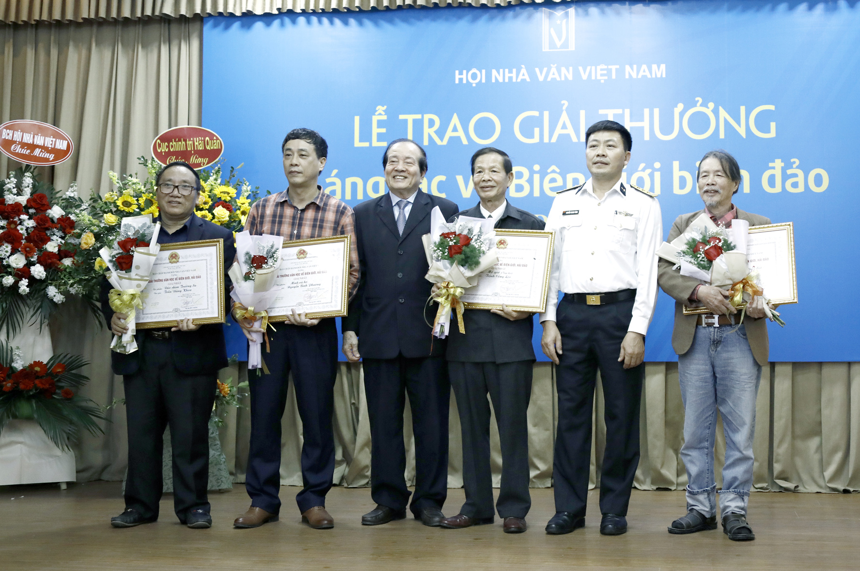 Nhà thơ Trịnh Công Lộc (người thứ 3 từ phải sang) nhận giải Nhất giải thưởng sáng tác về đề tài biên giới, biển đảo năm 2020. Ảnh: TG